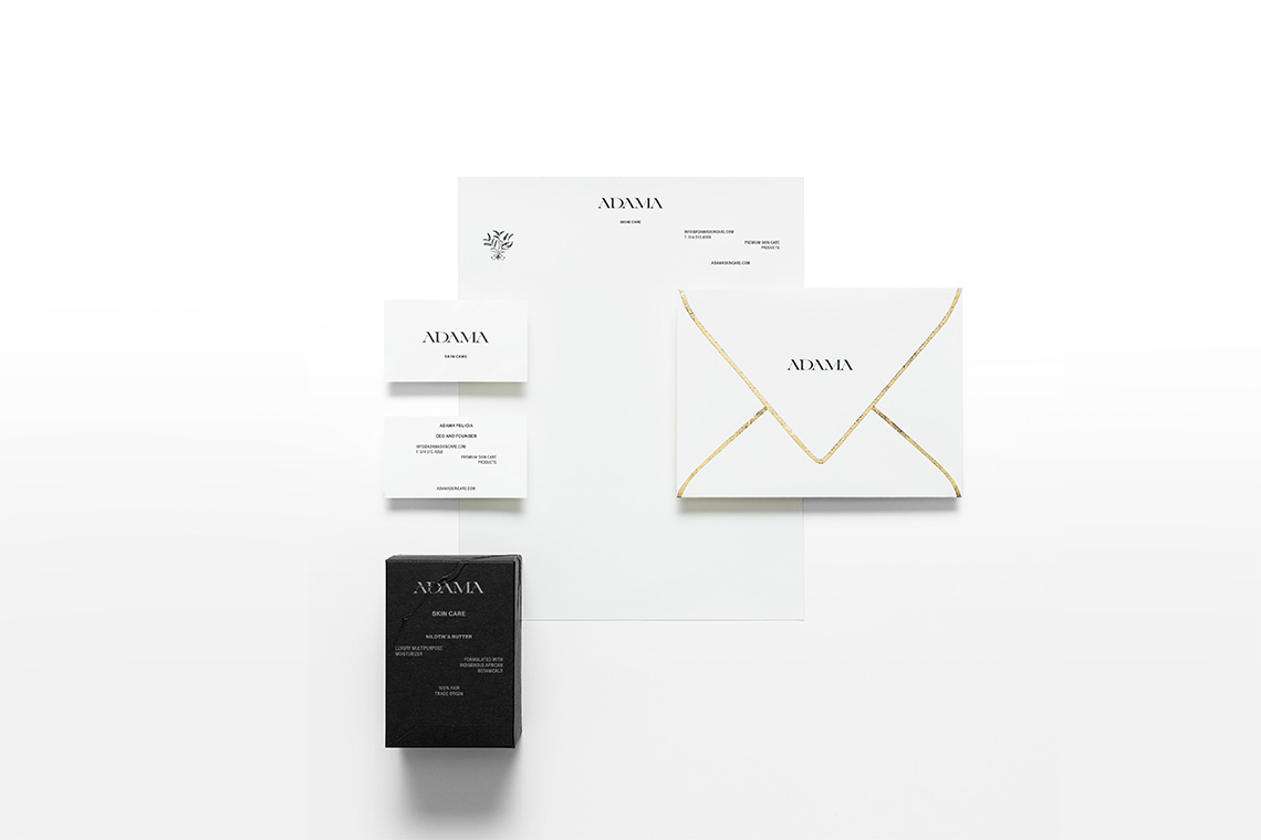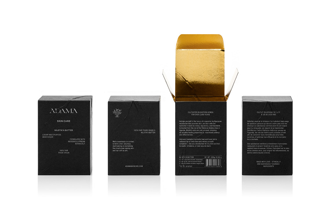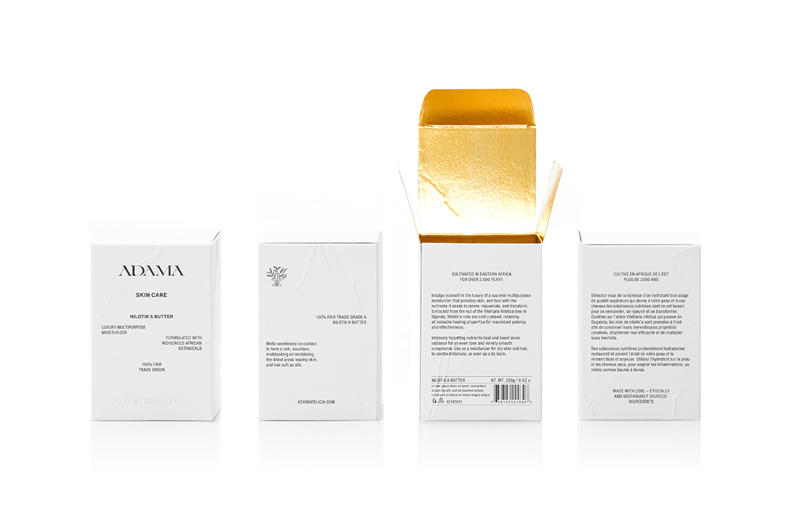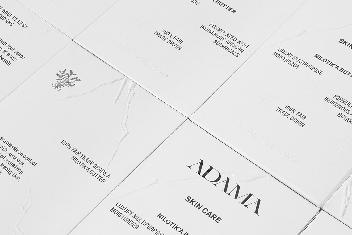 The brand features embossed roots representing the most important ingredient in their products, the Nilotik'a tree. Anagrama developed a sophisticated packaging enhancing and complimenting the Nilotik'a tree healing attributes. Reflecting the brand's elegance and purity, we employed black and white colours and accentuated details in gold striking an emphasis on the sumptousness of Adama's botanical products. — (A)
