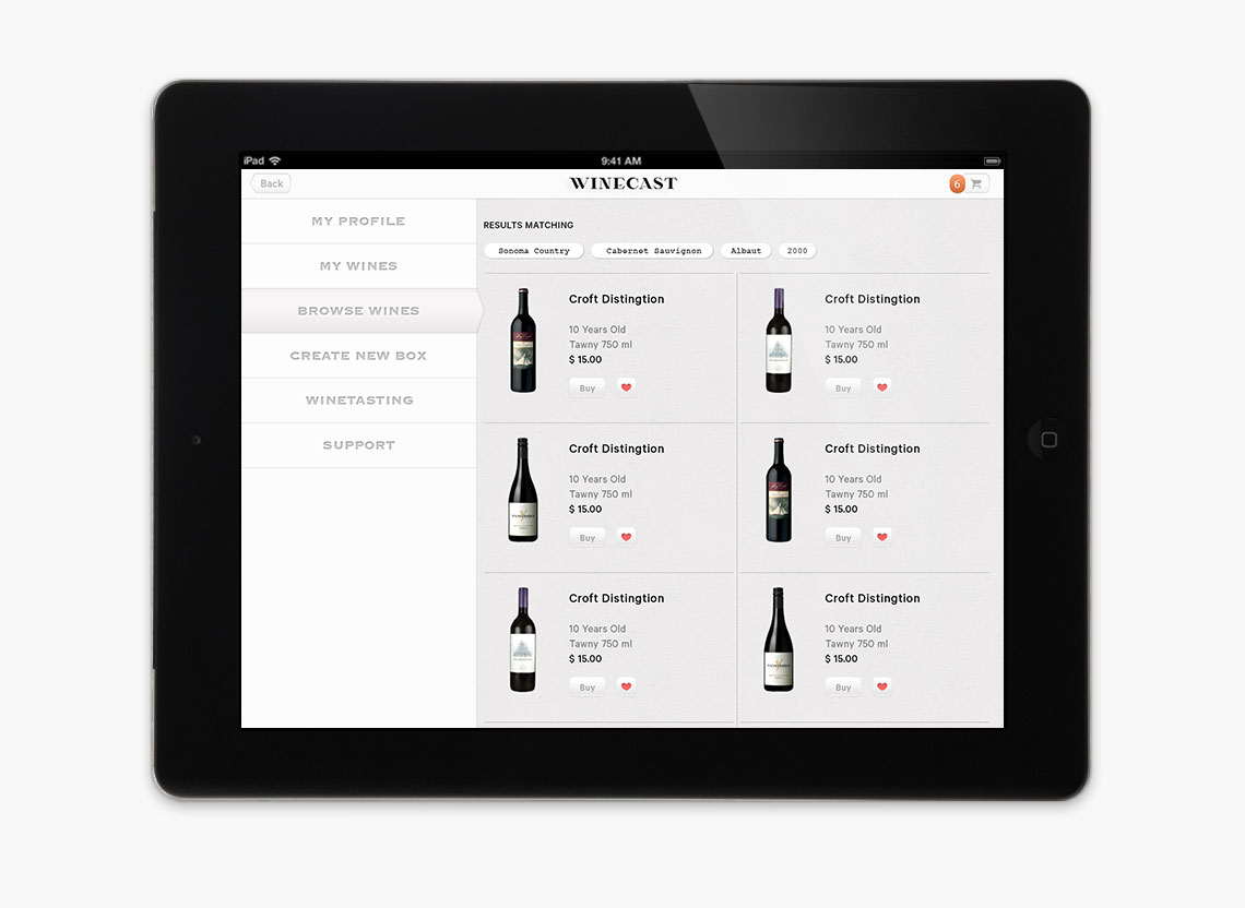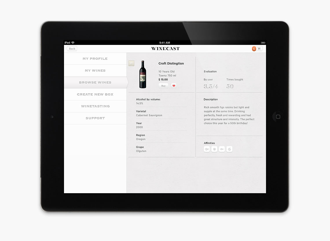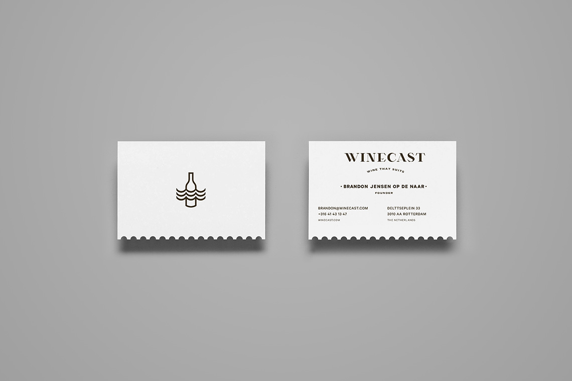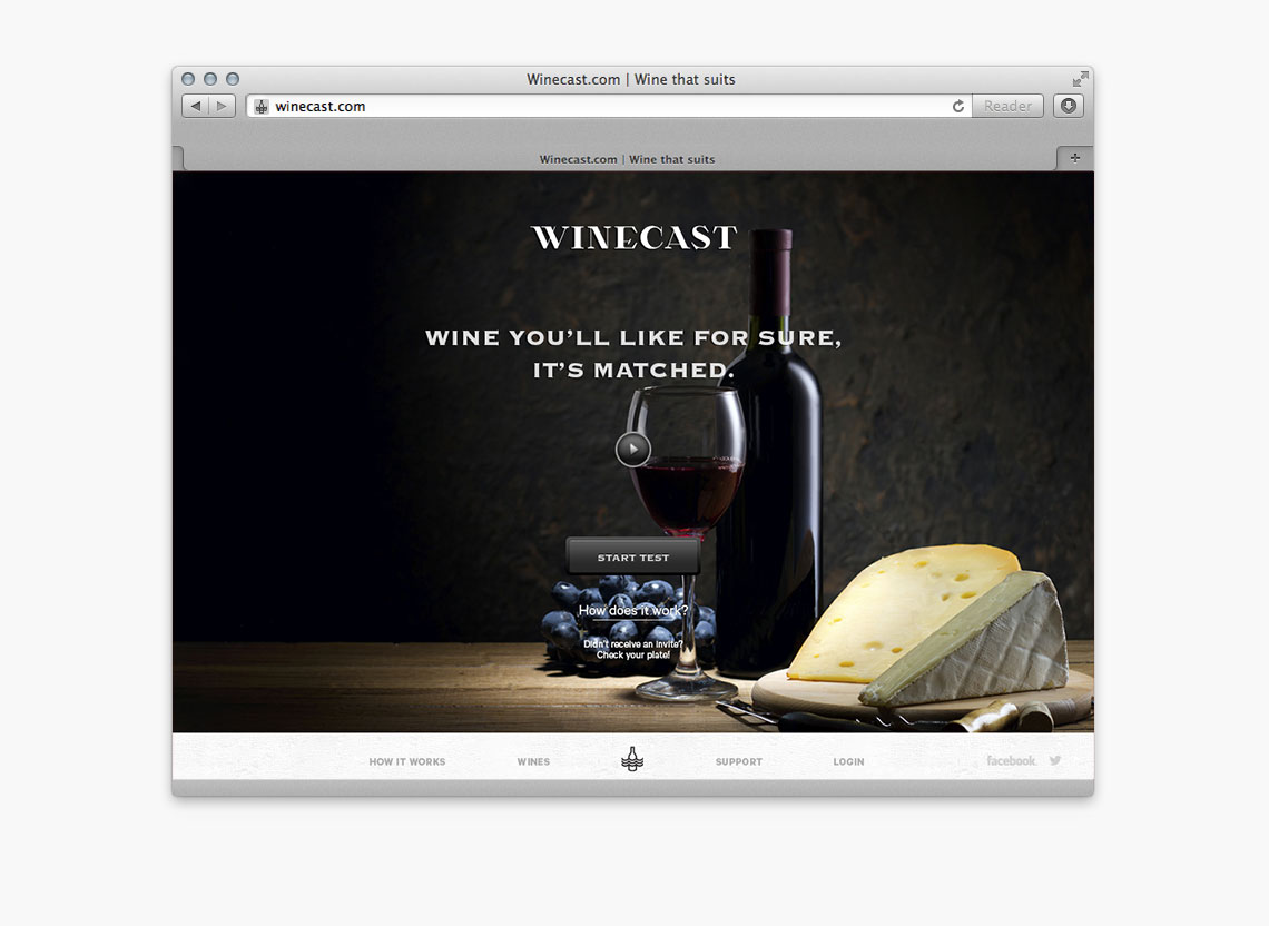 Winecast is an online wine-tasting, curating and delivery service based in The Netherlands. After taking a "tastetest" that takes likes, dislikes, tastes and habits into account, Winecast presents the user with a personalized (and further customizable) selection of six wines to be sent every month for a fixed fee.