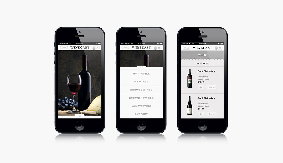 Our proposal began with the naming: Winecast sends a selection, or cast, of 6 bottles optimized to the user's tastes, much like actors selected for a play based on their aptitudes for a precise role. It could also be thought of as a cast molded specifically after a person's preferences.