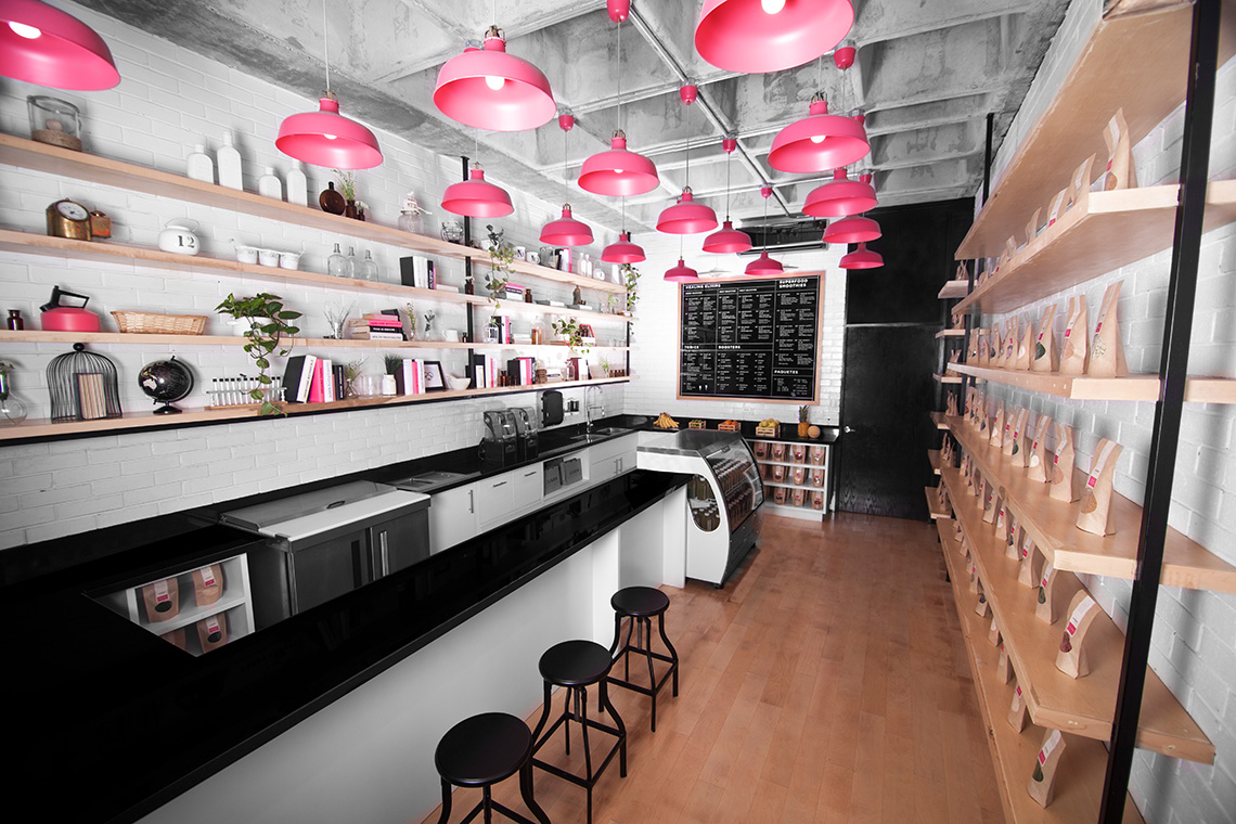 For the interior design we created a space that is a mix between a bar and an apothecary shop. The lighting, mostly natural light from the sun, together with the lush vegetation, the lab equipment and flasks, and the diverse books, creates a natural, warm, and inclusive space. — (A)