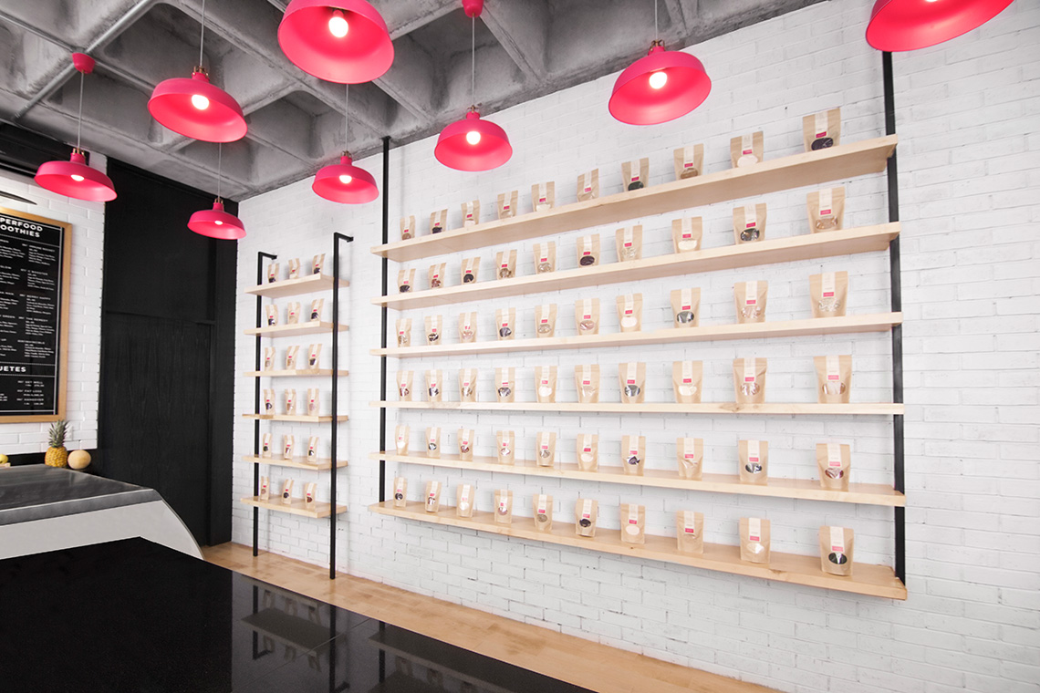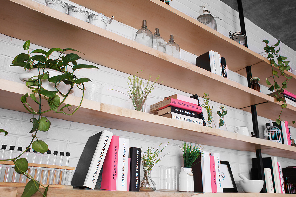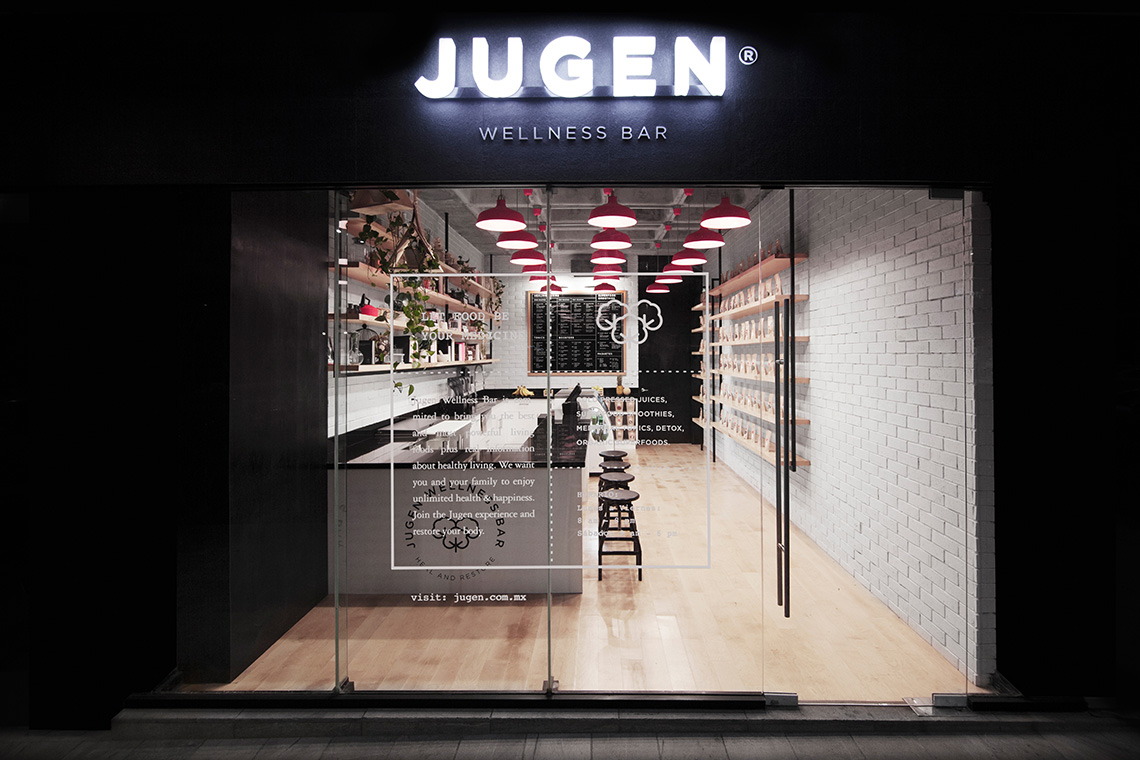 Since Jugen's products are created with the purpose to cleanse, heal, and detoxify the body, our design proposal takes inspiration from ancient herbal medicine bottles. We added modules to provide cleanliness, modernity and order, much like in a modern laboratory. For the interior design we created a space that is a mix between a bar and an apothecary shop. The lighting, mostly natural light from the sun, together with the lush vegetation, the lab equipment and flasks, and the diverse books, creates a natural, warm, and inclusive space. — (A)