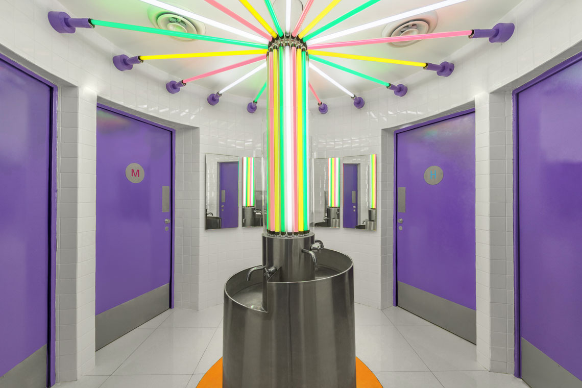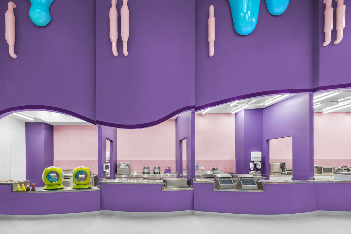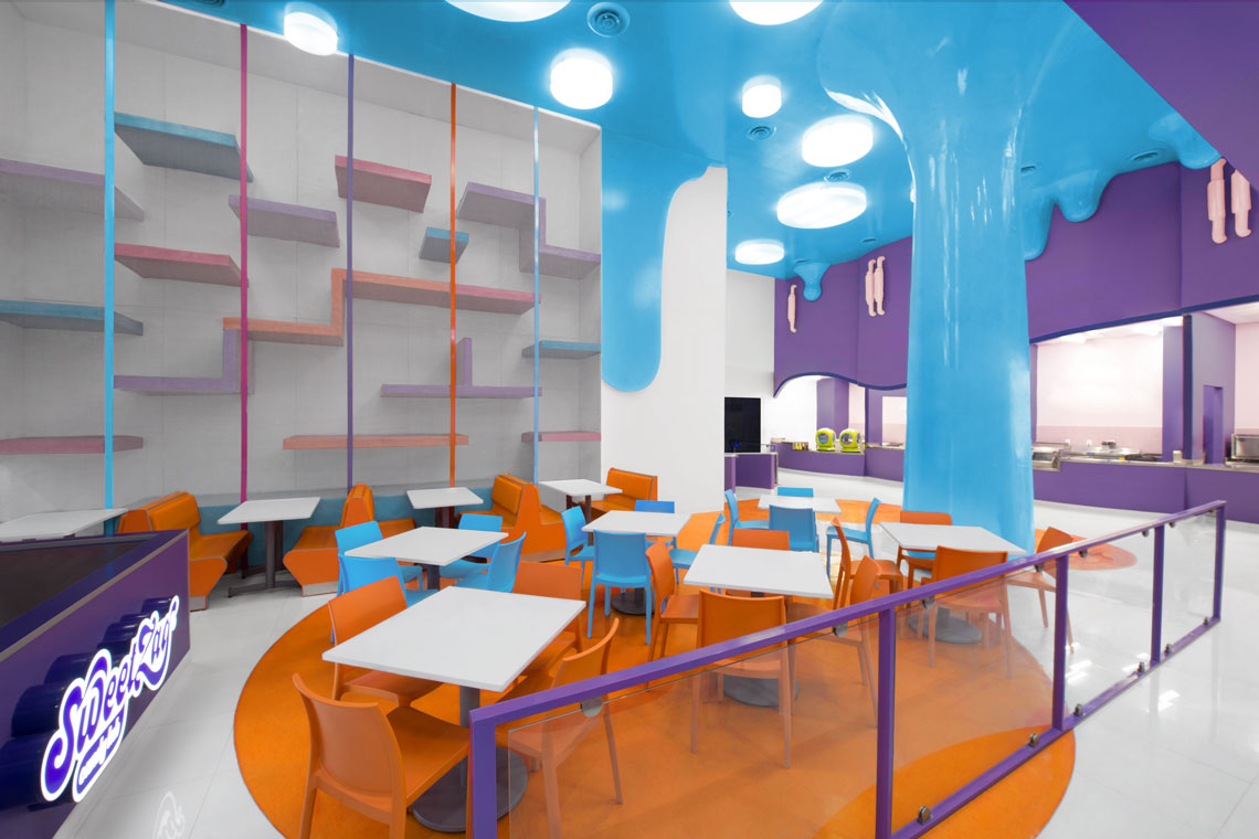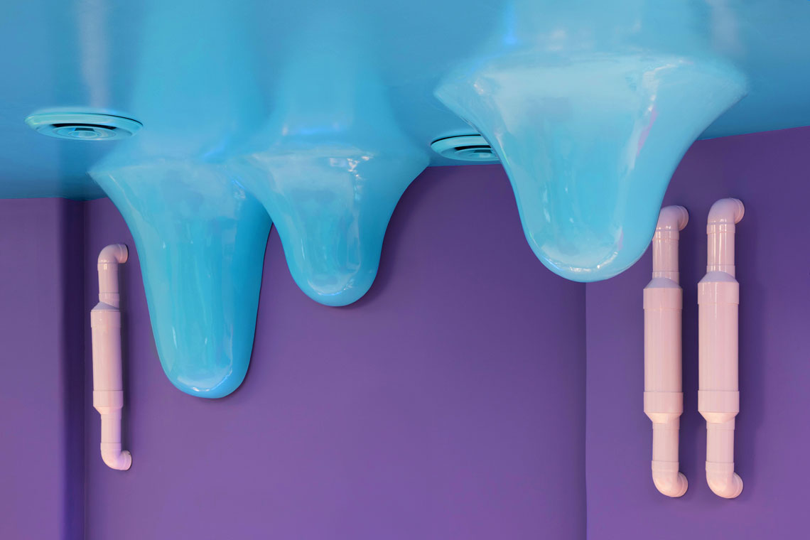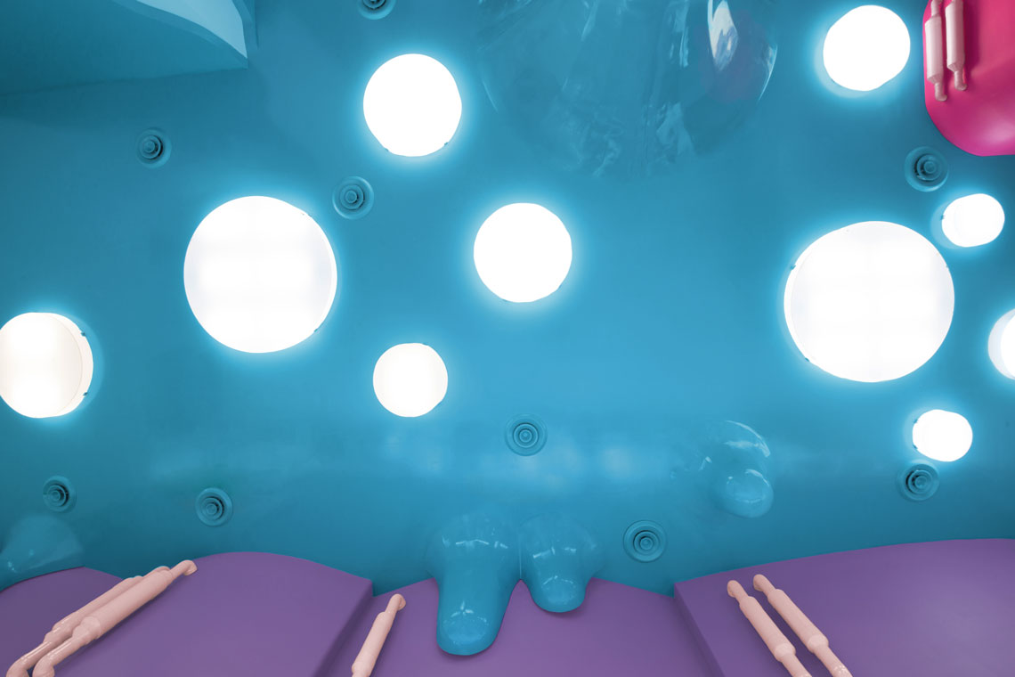 We’ve created a dream-like environment decked with candy columns, a crazy melting blue ceiling, and a touch of industrial motifs as seen on the pipe-like structures on the walls. A great mixture of colors and organic shapes interplay to create an immersive experience worthy of Alice in Wonderland. — (A)