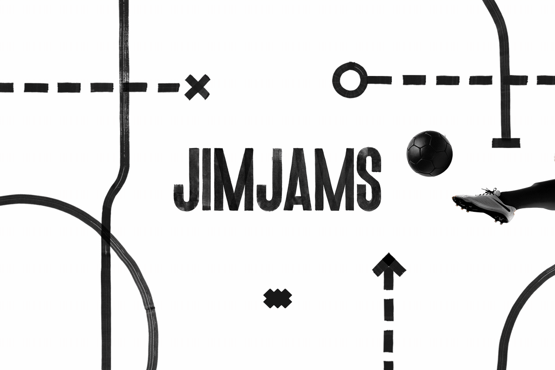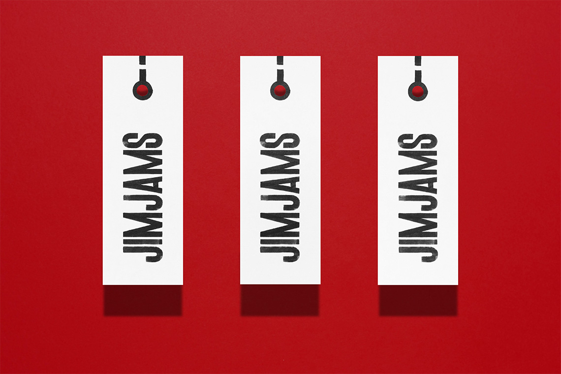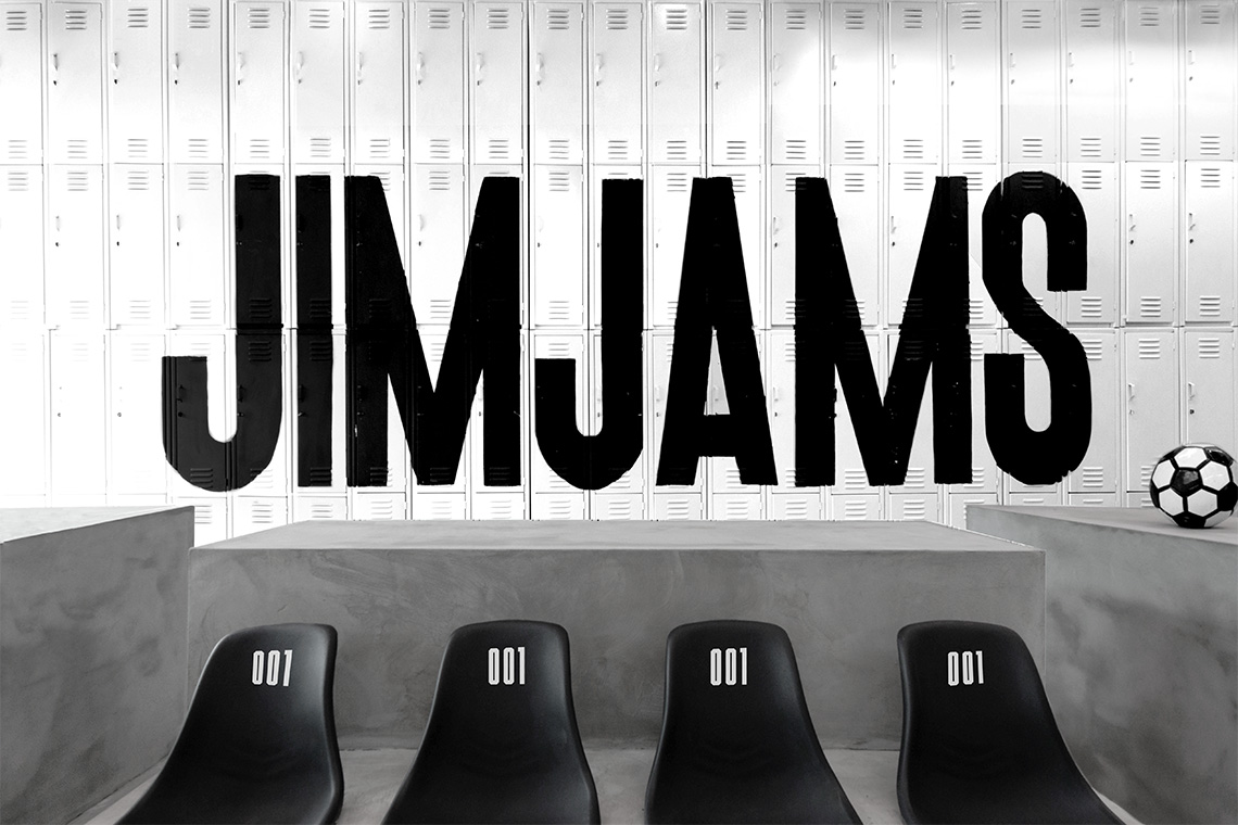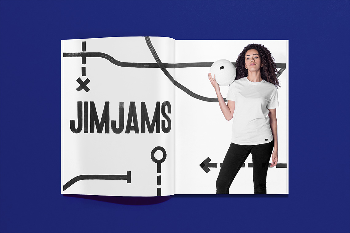 The custom typography is printed with textured strokes establishing a brand personality that plays fairly with the garment designs. The typographic system includes the Effra and Univers LT families employed in text arrangements on the branded peripherals. The JimJams icon is an abstraction of shapes appearing on footballs. This icon was developed to facilitate its embroidered application on textile surfaces and appearing legibly as a small signature in the various brand applications.