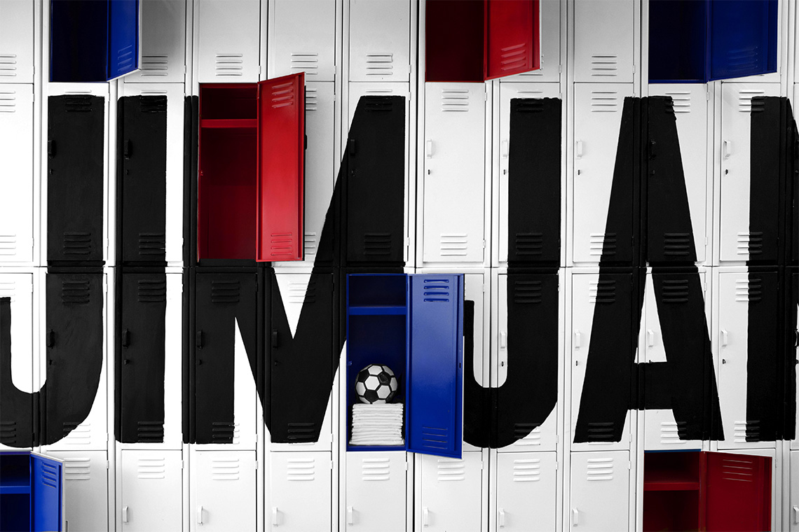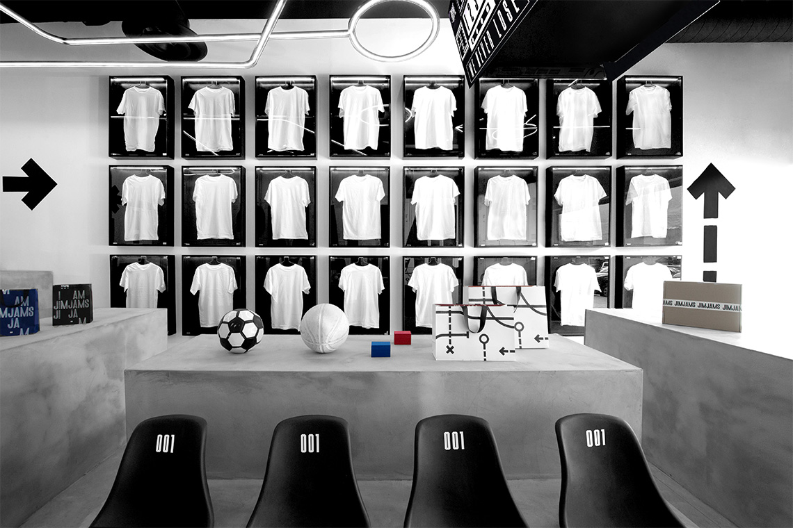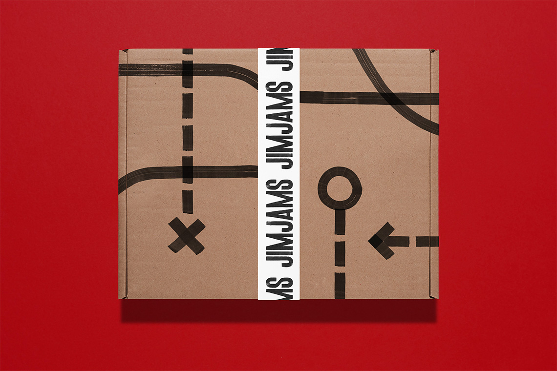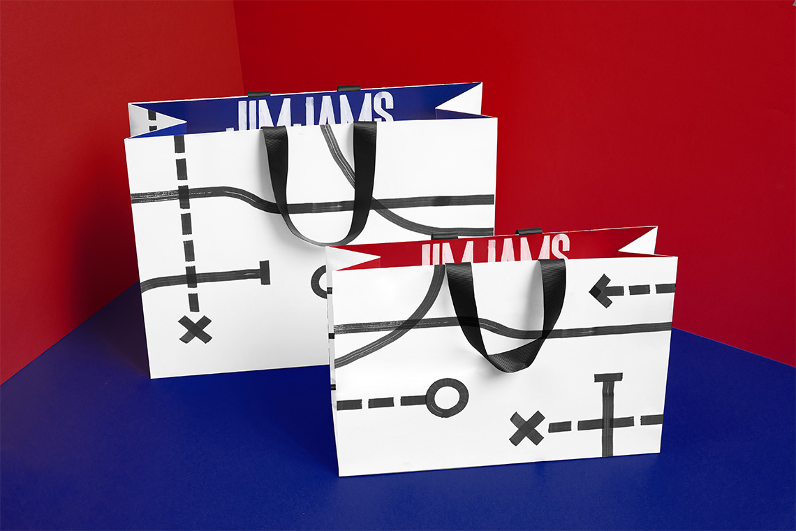 The custom typography is printed with textured strokes establishing a brand personality that plays fairly with the garment designs. The typographic system includes the Effra and Univers LT families employed in text arrangements on the branded peripherals. The JimJams icon is an abstraction of shapes appearing on footballs. This icon was developed to facilitate its embroidered application on textile surfaces and appearing legibly as a small signature in the various brand applications.