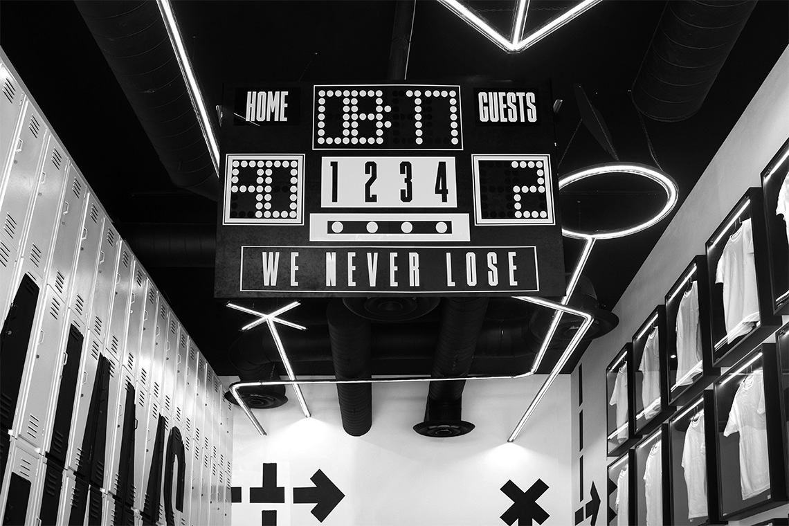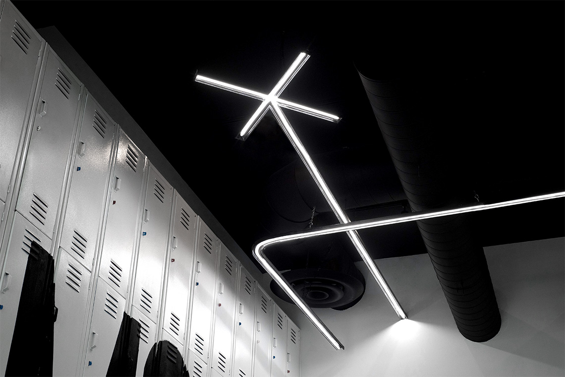 The logo is displayed on the lockers as part of the brand's deployment in the physical space. The brand pattern, referencing strategic play slates employed by coaches, was interpreted and converted into a luminaire on store ceiling. — (A)