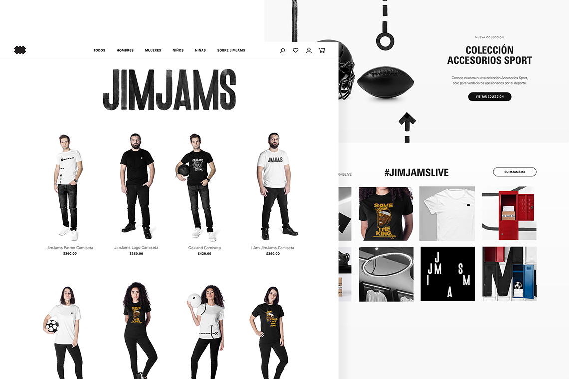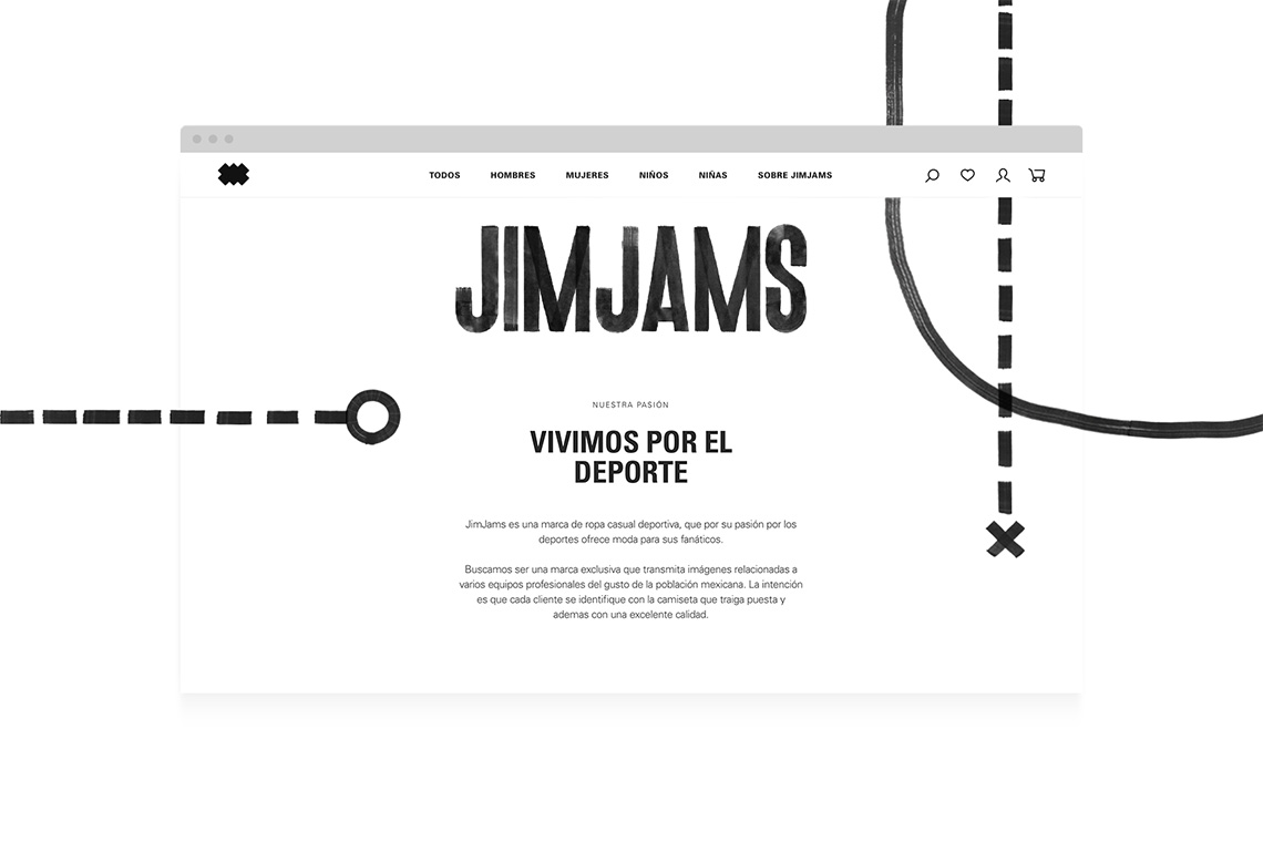 The brand pattern and the JimJams logo were integrated into the website design, managing to capture the brand's graphic behavior in the digital medium. We employed the Univers typography with its different weights and styles generating hierarchies and a dynamism that surprises when prioritizing the website's functionality.