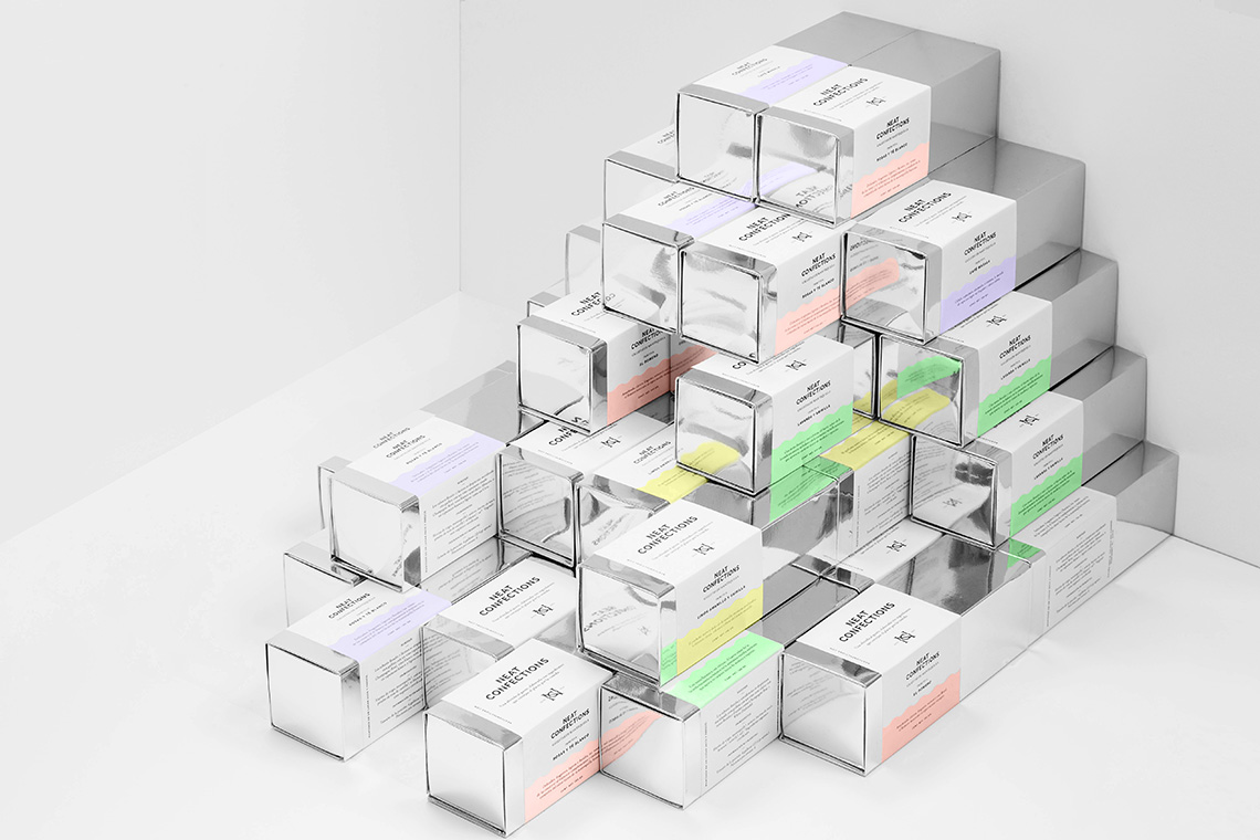 The silver chrome surfaces in every piece allow the confections to stand out. The slight touch of neon pastel color on the labels add warmth and functionality. Our branding proposal not only upraises the confections and the brand's innovative idea of pairing them with wine, but it also provides a feeling that the pastries themselves are a tribute to taste, just as the tagline remarks. — (A)