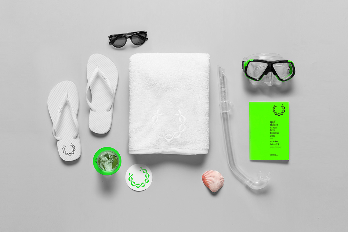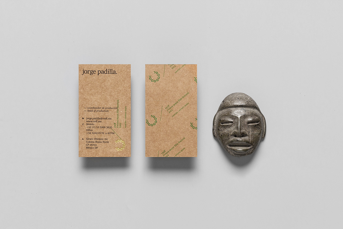 The logo is a comprehensive visualization of a wreath, of two intertwined snakes, of a mayan necklace and of the shape of the sun and its irradiating heat. Staying true to the festival's mission, we designed the stationery and distinct design pieces with eco-friendly and recyclable materials in mind.