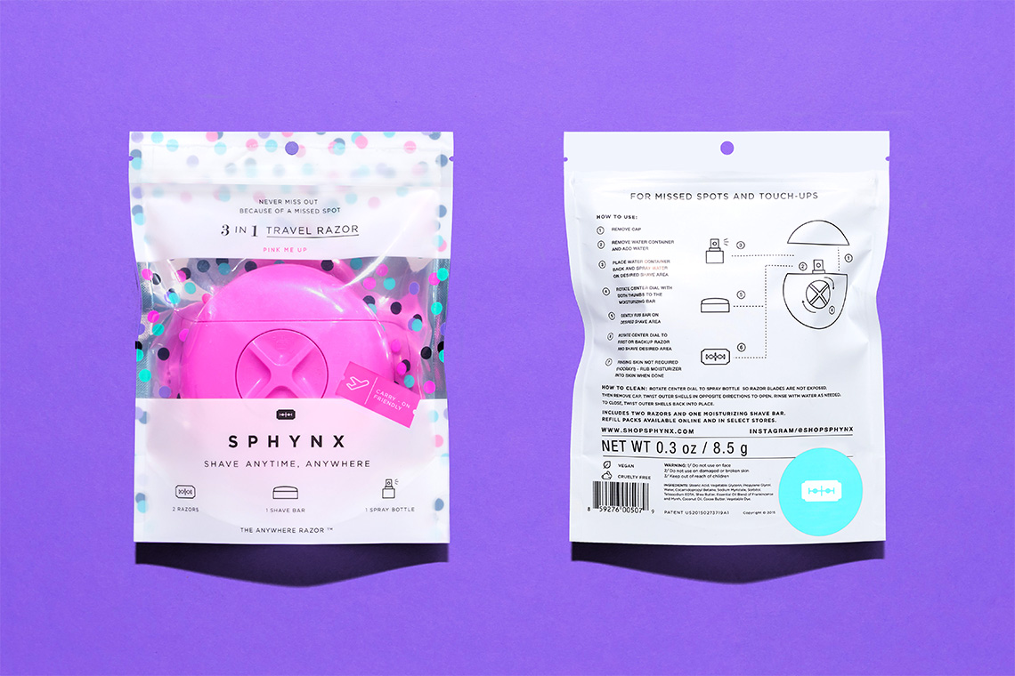 Sphynx is a product that seeks facilitating the shift on perception of traditional and complicated beauty routines. It comprises a shaving device with a simple mechanism that can be set in one of four positions for its use: The first unveils a rechargeable water spray that helps refresh the skin before shaving. The second one includes a moisturizing soap made from shea butter to moisturize the skin. The third shows the razors employed for shaving. The fourth and last position stores a piece of soap.