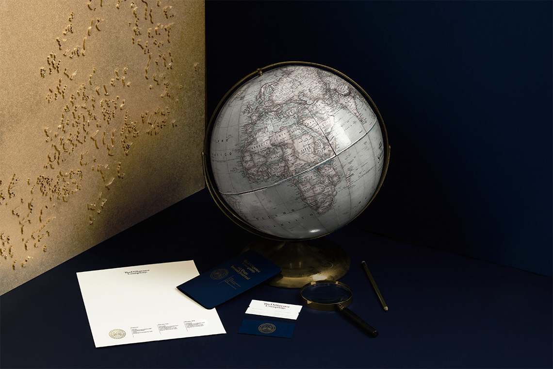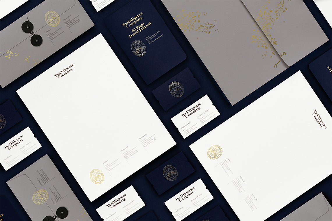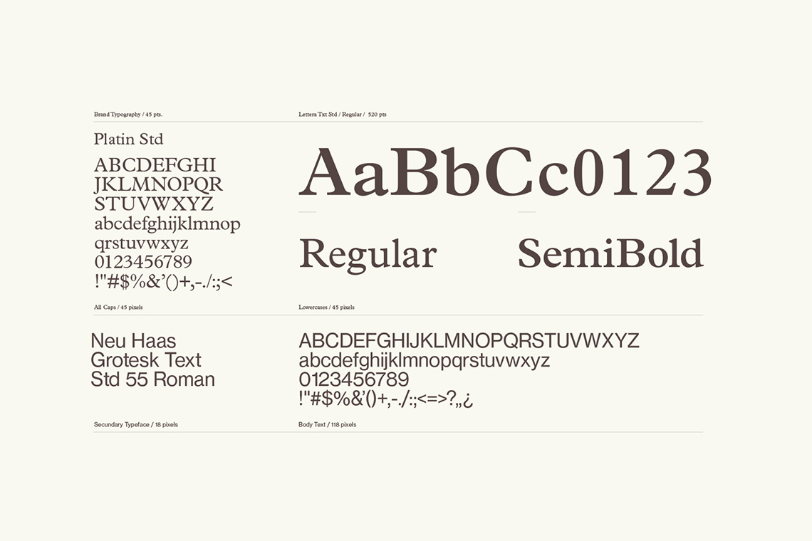 The color palette, leans to the dark blue reminding us of the ocean and its voyages. The usage of blue, at the same time, represents formality and experience, part of the company's personality. The golden touches add the elegance and exclusiveness tones required by the brand. The typographical selection presents contrasts with the usage of the serif Platin and modern touches on behalf of Neue Haas Grotesk.