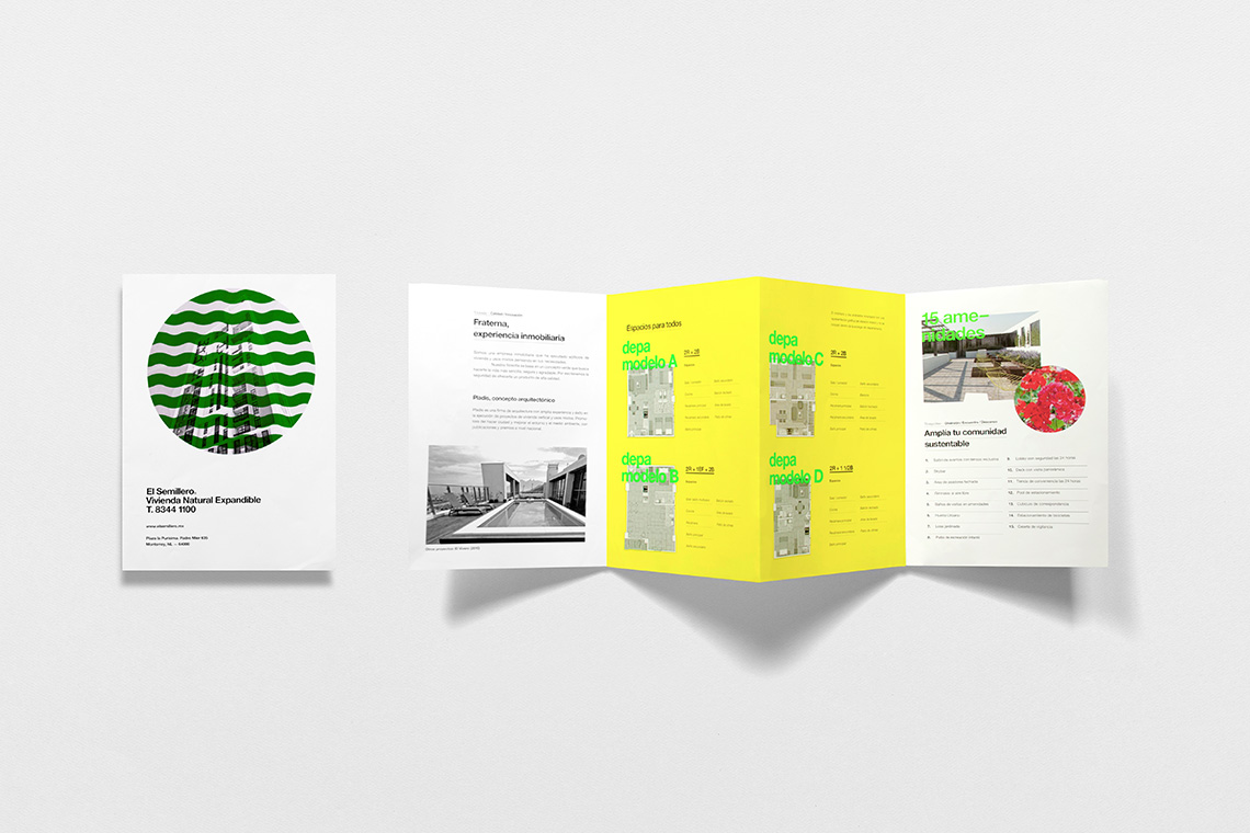 Nuestra propuesta de marca evoca a la naturaleza y espacios amplios, denotando el dinamismo en los detalles de “El Semillero”. El uso de una paleta de color ‘cítrica’ puede compararse a la del proyecto antecedente “El Vivero”, cuya paleta era monocromática en su mayoría. La marca se complementa con ilustraciones de la ciudad en isometría que muestran puntos representativos y áreas comunes demostrando las ventajas de habitar estos departamentos. “El Semillero” es una iniciativa necesaria para revivir las áreas culturales que se encuentran al borde del olvido. — (A)