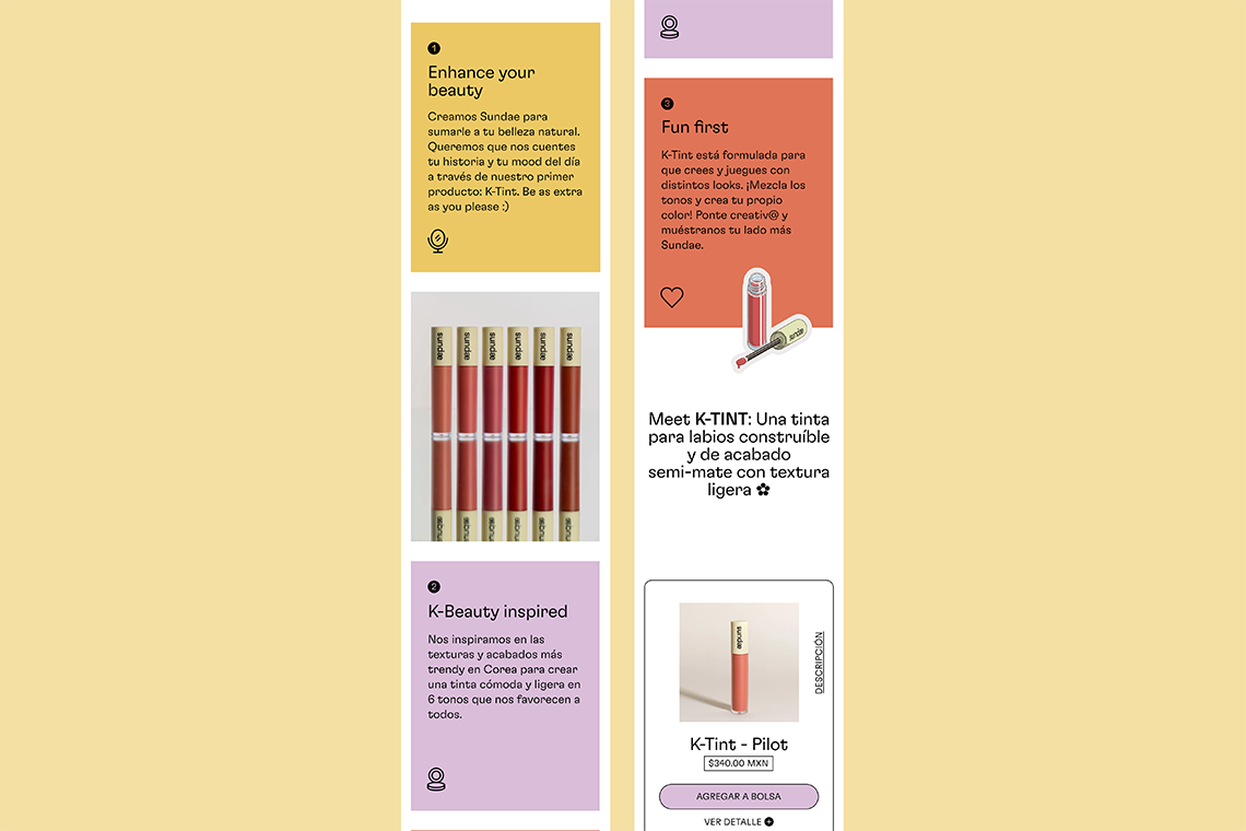 Inspired by the characteristics of K-beauty, we managed to reflect the bold and easy-going personality of this new launch in a landing page that’s easy to navigate with dynamic interactions displaying finishes and textures.