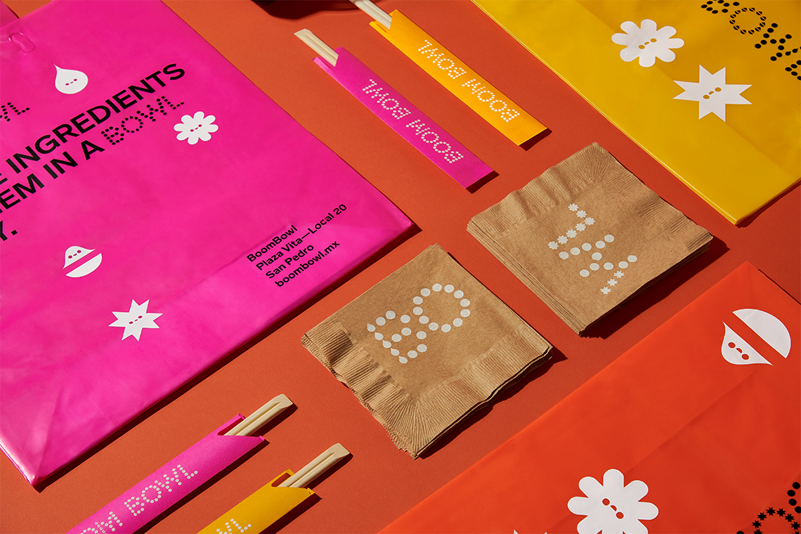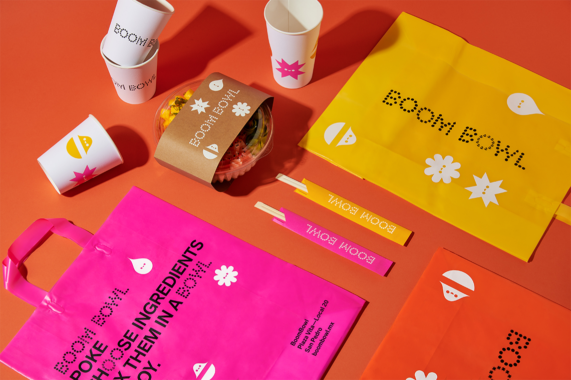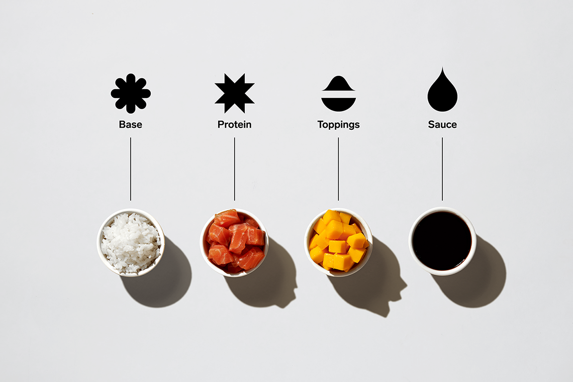 The identity for this project is based on the visual representation of the ingredient-mixing culture, hand in hand with the practicality and personalization of the poke. We created a dynamic typography based on Lab Grotesque by Letters From Sweden with a point based system including four icons working individually and representing the components that constitute the dish: base, protein, toppings, and dressings. The icons' face elements were designed to match with the typographic dot system. The resulting logo generates variants claiming advantage of its typographic versatility. — (A)