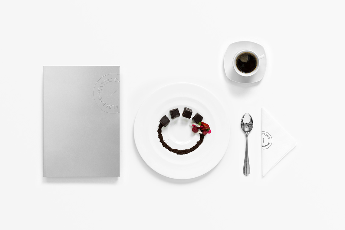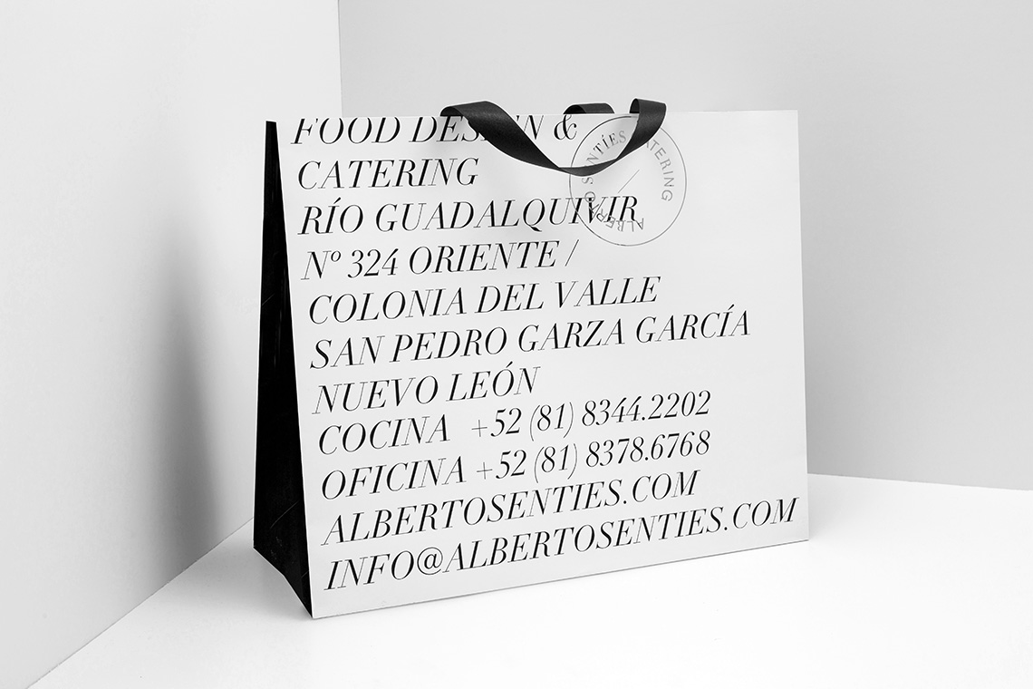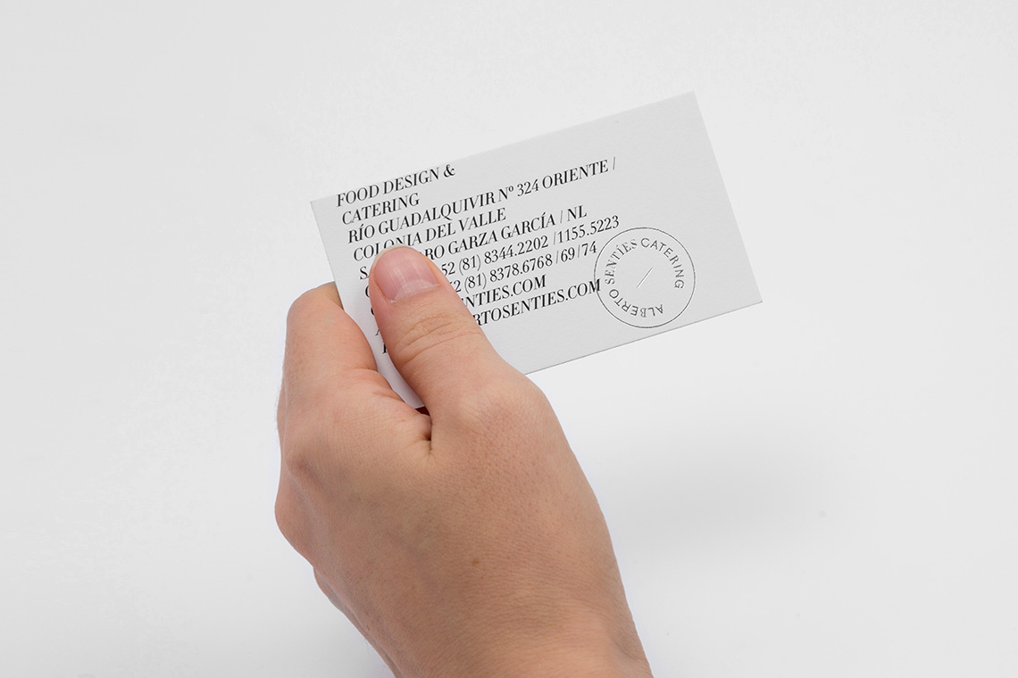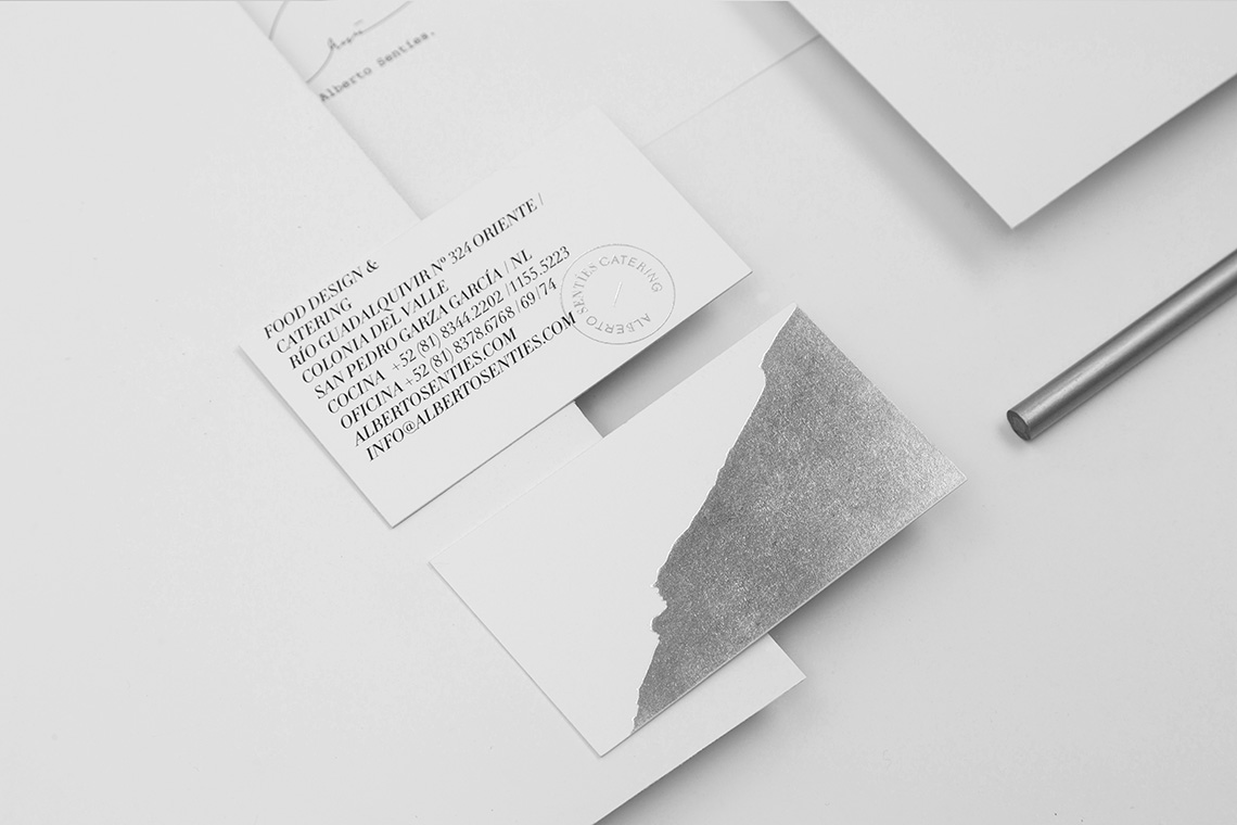 Our design proposal upraises Sentíes' authorship primarily by the use of a seal to communicate his gastronomic mastery. The seal uses a typographical combination of Akzidenz Grotesk and Didot to to give it a surprising, elegant and modern touch. The vast play on typography found throughout the brand represents the chef's creative and expansive use of texture in his culinary creations. His style is clinically clean, precise and loyal to its location, the northeastern city of Monterrey in northern Mexico. The business card's odd foil patch is actually a piece of the city's iconic Cerro de la Silla silhouette. — (A)