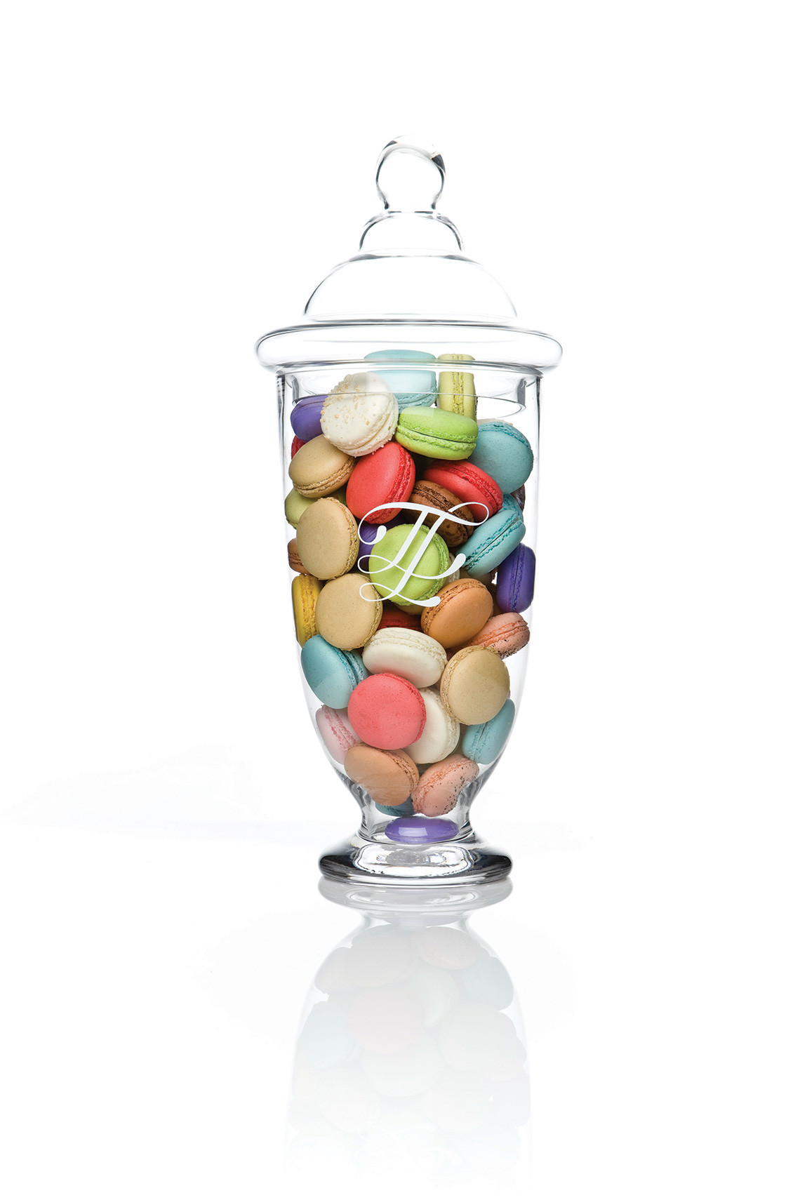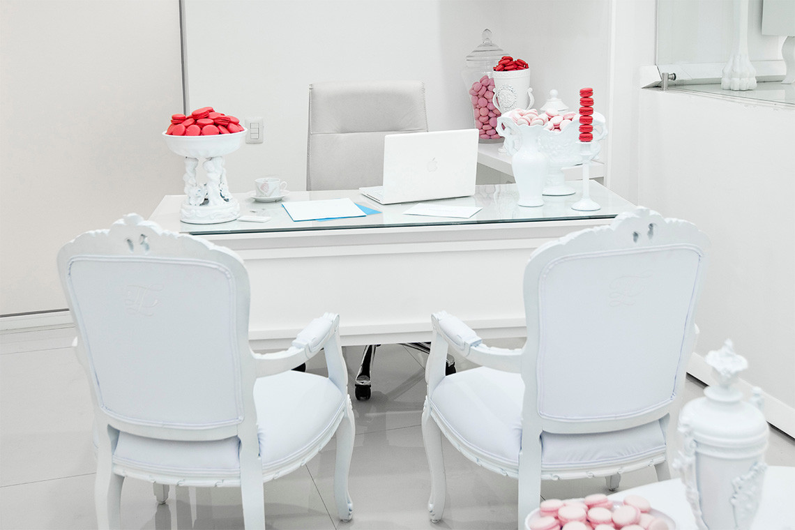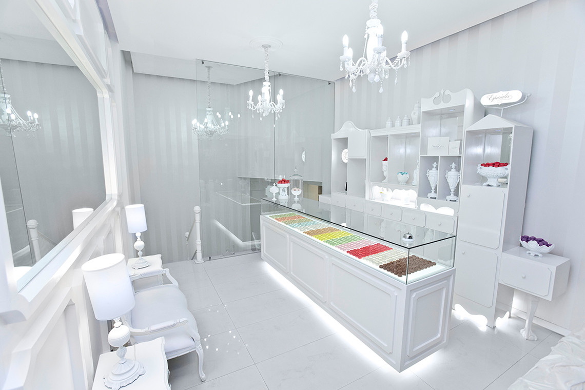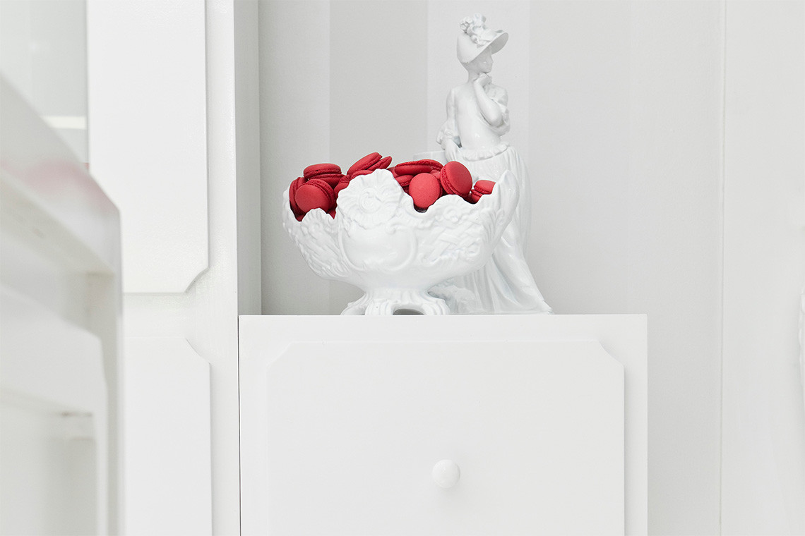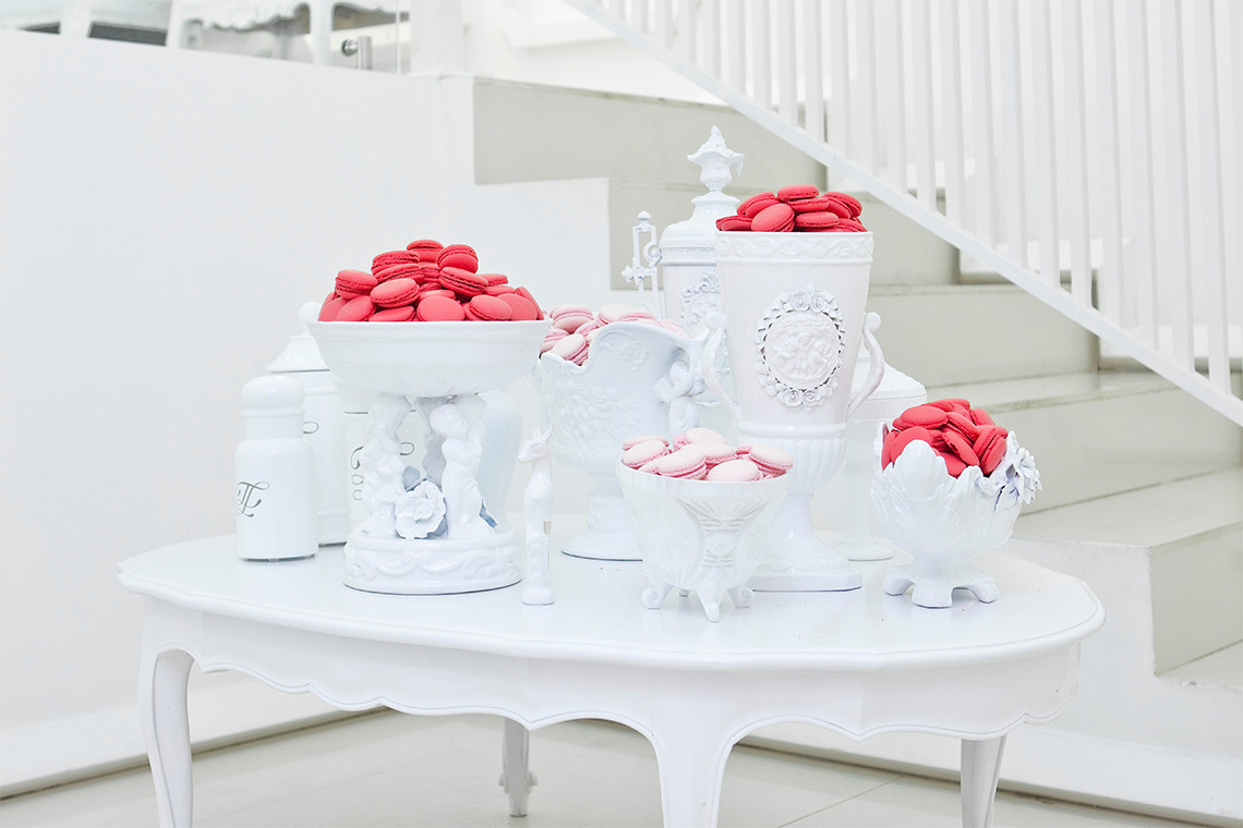 El color blanco es una parte central del diseño y juega con el contraste de los colores de los macarones franceses.
