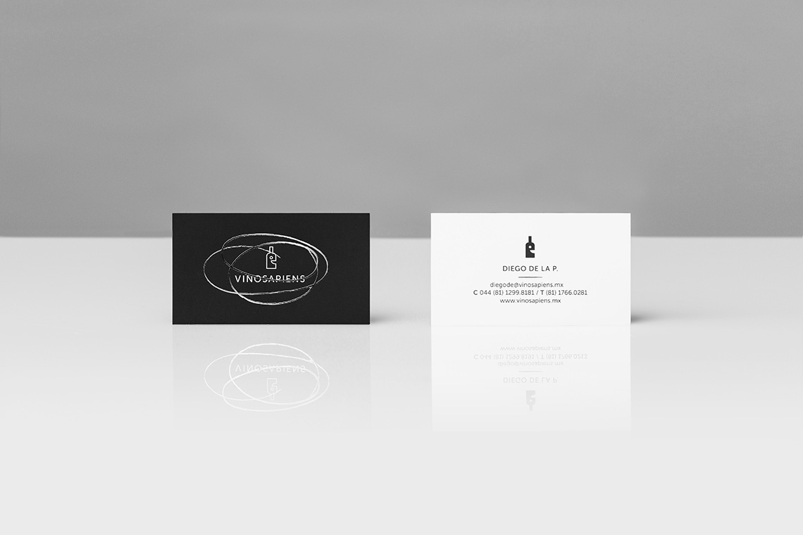 The naming is a combination of the words 'vino', the Spanish word for wine, and sapiens, the Latin word meaning wise. One definition for 'wisdom' states that one who is wise is someone who knows how to choose. The naming, combined with the happy wine bottle icon, conveys and image of trust and friendliness. The circled marks on the stationery reinforce the idea of choosing as a form of wisdom. Our choice in uncoated black paper stamped with the touch of silver foil reflects Vinosapiens' good taste and excellent quality in service. — (A)